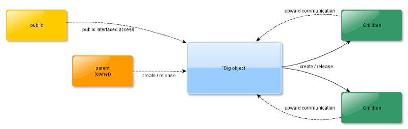 Now, if we consider one of the object’s children, the upward communication became trivial as long as the concerned child keeps a reference on its parent through a dedicated interface (which can easily be given on the construction).